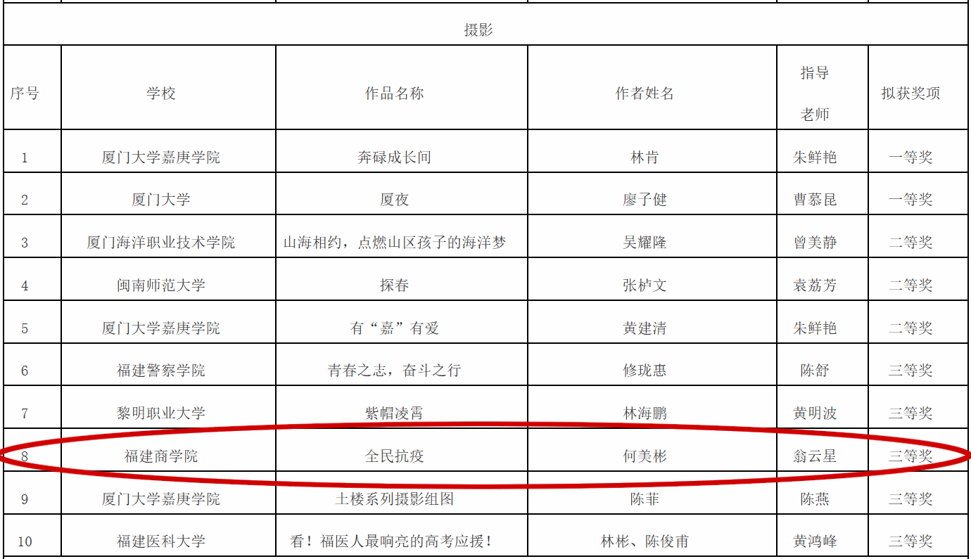 近日,由福建省委教育工委、福建省委网信办联合举办的第六届全省大学生网络文化节获奖名单揭晓。其中,我院学子何美彬的作品《全民抗疫》(指导教师:翁云星)在此次比赛中荣获摄影类作品三等奖。