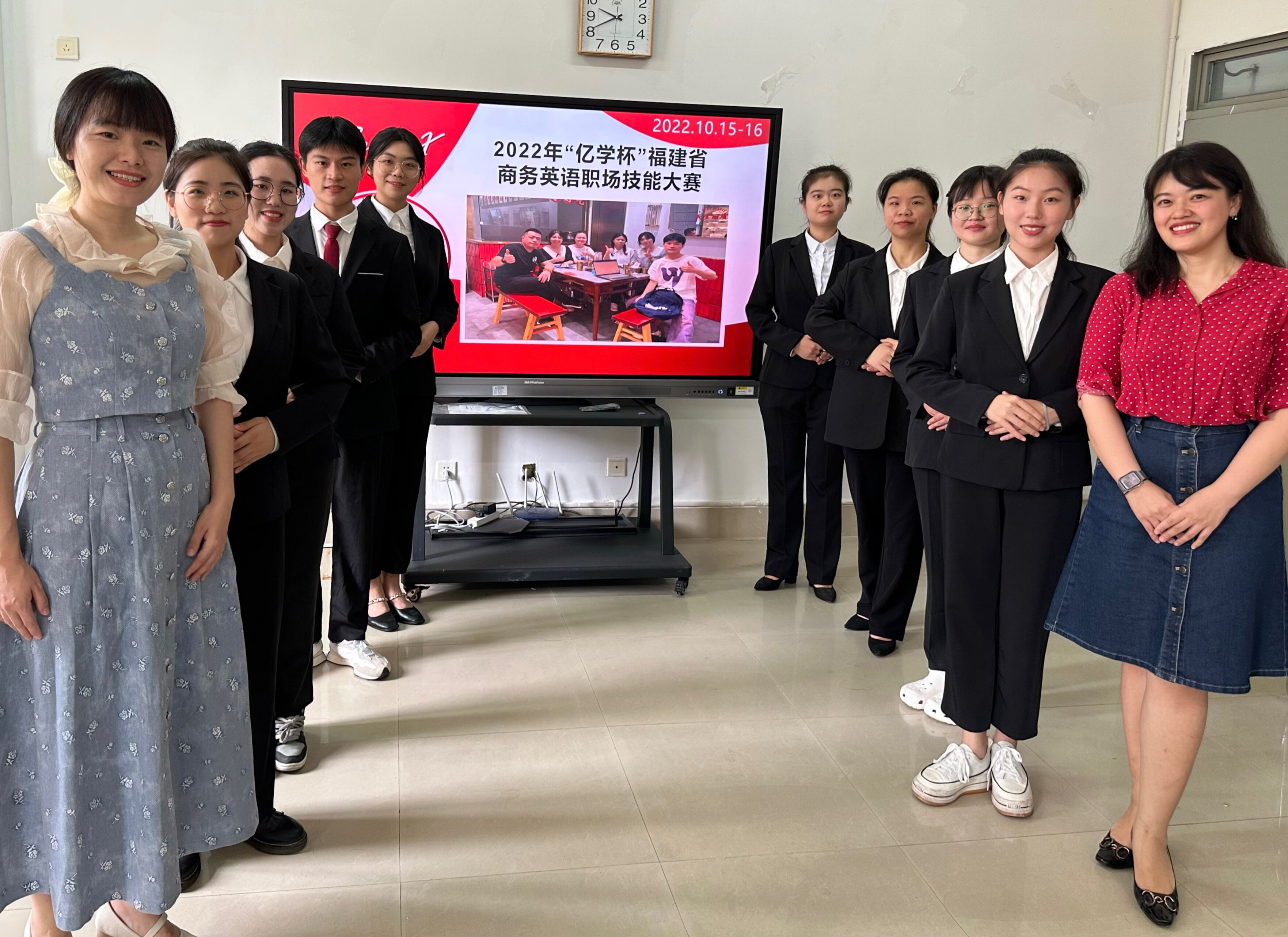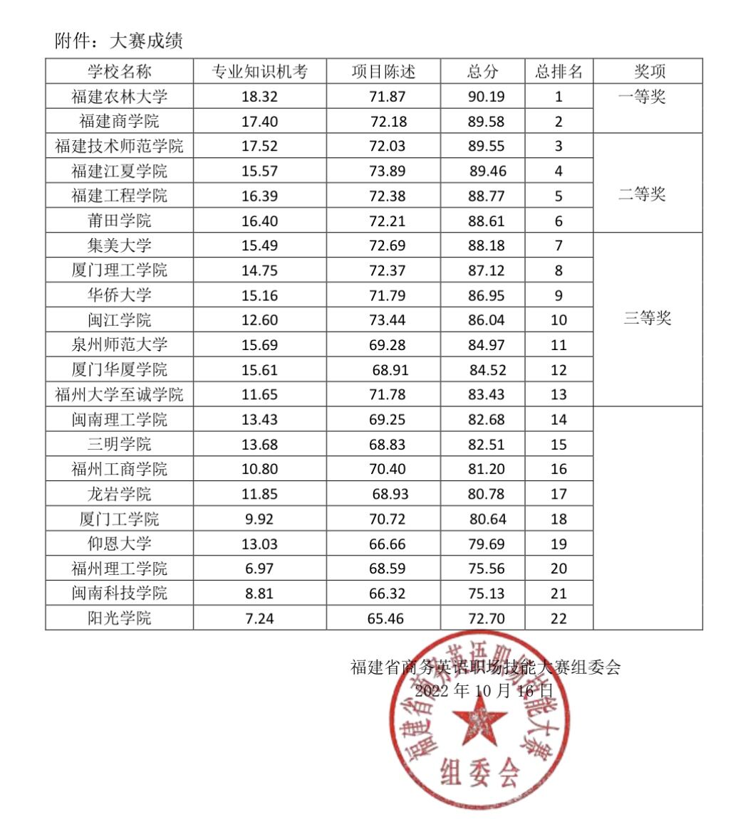 由福建省教育厅主办的2022年“亿学杯”福建省商务英语职场技能大赛于2022年10月16日落幕。经过专业知识机考、项目英文陈述、在线问答三个环节的激烈比拼,我校欧美三级在线商务英语专业饶丽、姚家煌、郑梦婷、曾洲桐、张静茹、李嘉莉、肖莹、陈宇璐八位同学所组成的Spark X参赛代表队(指导老师:江盈盈、柯佳音)从全省22支参赛队伍中脱颖而出,荣获一等奖,是我校在该赛事中取得的最好成绩。