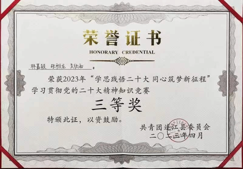 2023年4月25日,由共青团连江县委员会主办,共青团福建商学院委员会、共青团福州理工学院委员会承办,福建商学院学生协办2023年的“学思践悟二十大,同心筑梦新征程”学习贯彻党的二十大知识竞赛决赛于连江校区明德楼学生活动中心举行。由我院20级商务英语3班张雅龙,21级商务英语2班林嘉颖,21级日语1班吴欣雨三位同学组成的福建商学院第一代表队在竞赛中沉着冷静、协助作答,最终荣获三等奖的好成绩。