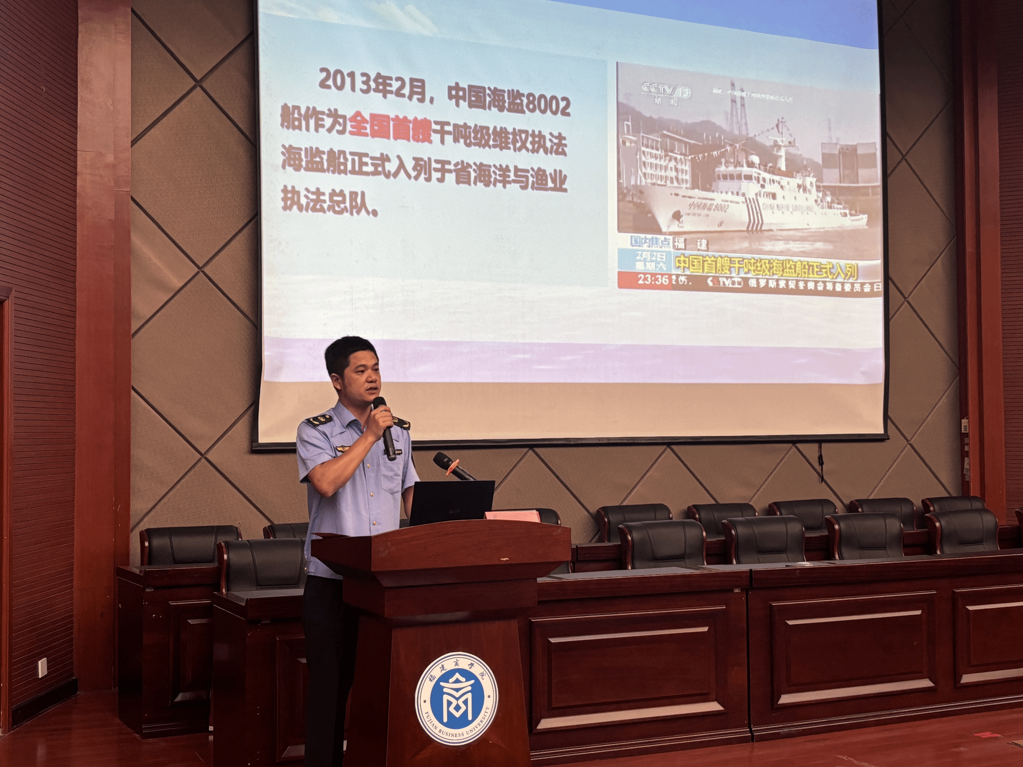 为纪念中国人民抗日战争暨世界反法西斯战争胜利80周年,激励广大师生传承红色基因、赓续红色血脉,9月23日,欧美三级在线开展“弘扬伟大抗战精神,青年矢志奋斗担当”爱国主义教育主题讲座。本次活动特邀福建省海洋与渔业执法总队执法船船长、“全国人民满意的公务员”邱卫华主讲。陈发义政委一行8人、学院党委副书记杨爱娥、全体辅导员和近300名学生参与本次活动。