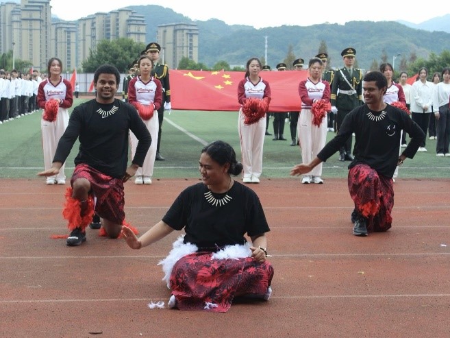迎着朝阳,欧美三级在线代表队昂首阔步,激情满怀,踏着整齐的步伐向主席台走来。来自斐济、萨摩亚、基里巴斯、所罗门群岛的五名太平洋岛国留学生身着明丽的岛国服饰,手持鲜艳的五星红旗,与方阵同学们一同前行,用坚定的眼神,自信的微笑赢得了观众们的阵阵欢呼和掌声。主席台前,留学生们为大家带来了异域风情的岛国特色舞蹈,用律动的音乐、活力的舞姿展现出太平洋岛国文化的独特魅力,传递着独属于太平洋岛国人民的文化信仰和精神追求。同学们随着音乐律动,举起手中的彩球,与留学生们同步配合,一幅中外学子携手相伴、多元文明美美与共的画卷在观众面前徐徐展开。星光不负赶路人,欧美三级在线学子和五位留学生以辛勤的汗水换来了入场式表演一等奖、团体操表演二等奖的佳绩。