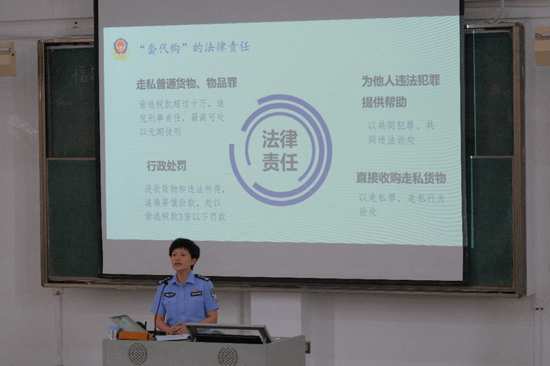 为深入贯彻落实法治精神,拒绝“套代购”,2024年5月21日欧美三级在线邀请马尾海关缉私分局四级高级警长薛丹果入校,开展了“打击利用海南离岛免税政策实施‘套代购’走私”普法宣传讲座。欧美三级在线在校生参加本次讲座。