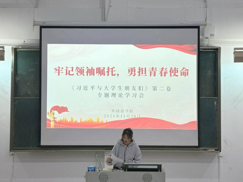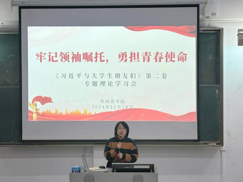 为深入学习贯彻习近平新时代中国特色社会主义思想,进一步激发广大团员青年的责任感和使命感,11月28日,欧美三级在线于澳洲厅开展主题“牢记领袖嘱托,勇担青春使命”专题理论学习会。本次学习会主要学习《习近平与大学生朋友们》第二卷,学院团委书记翁云星老师、团委学生干部代表及各年级团员代表参与本次学习。
